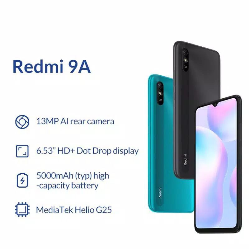 Redmi 9A Ram 4 Spesifikasi. Xiaomi redmi 9a hadir dengan membawa spesifikasi layar berukuran 6.53, mediatek helio g25 dengan kamera utama sebesar 13 mega piksel Spesifikasi utamanya adalah cpu mediatek helio g25 chip, penyimpanan internal 64gb dan ram 4gb. Xiaomi redmi 9a memiliki layar 6.53 inci inci yang cerah dan jernih (resolusi 1600x720) inci dan ukuran 164.9 x 77.1 x 9mm. Deskripsi xiaomi redmi 9a 4/64gb. Helio g25 (12 nm) kamera: